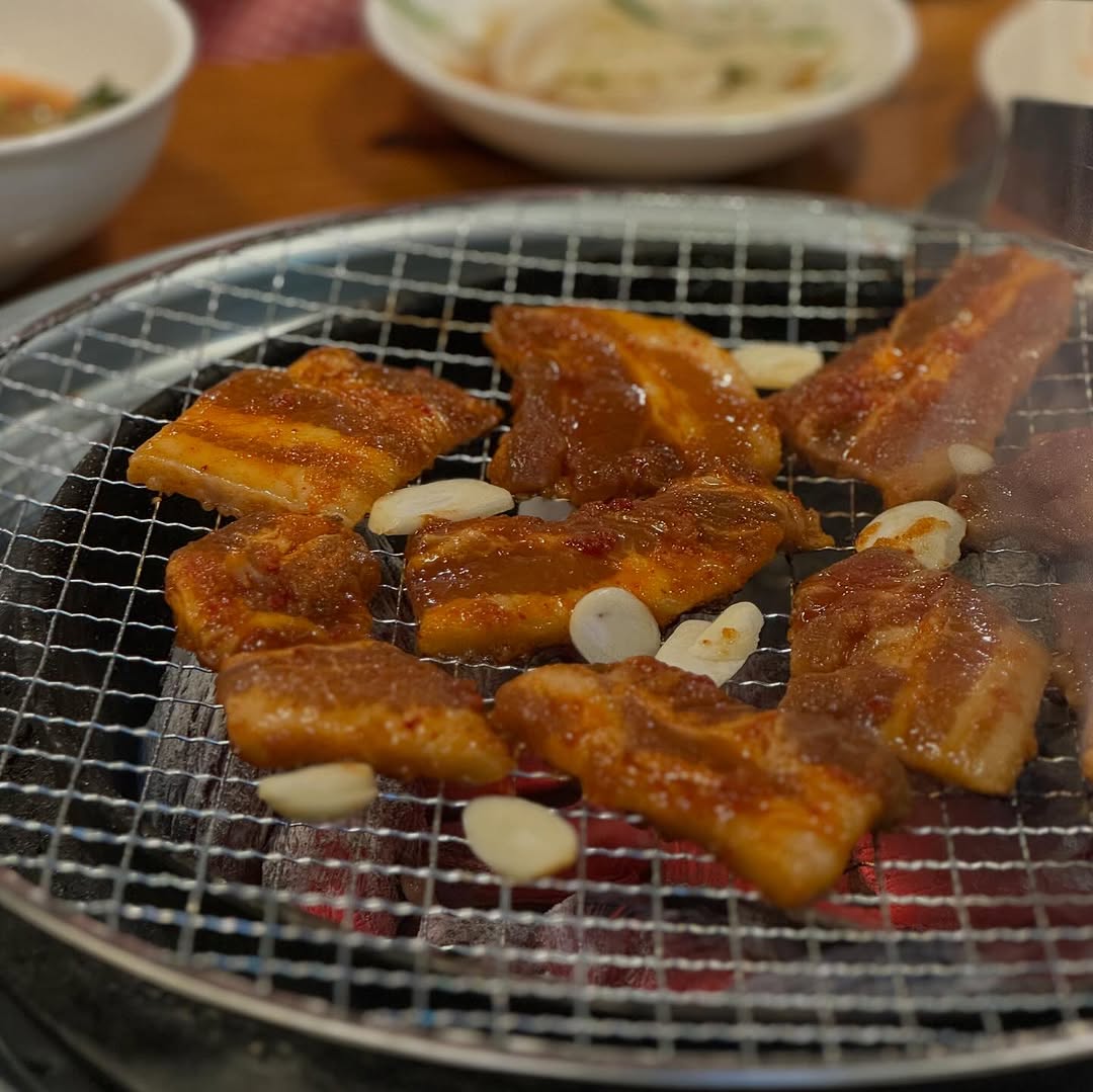 자리에 앉자마자 등장하는 기본 반찬들도 정말 푸짐하고 정갈했어요. 특히 파절이! 😲 평소 파절이를 즐겨 먹는 편은 아닌데, 여기 파절이는 들깨를 듬뿍 넣어서 고소함이 남다르고, 산미가 더해져서 느끼함을 싹 잡아주더라구요! 👍🏻 숯불에 노릇하게 구운 고기와 함께 먹으니 그야말로 꿀맛! 🍯 쌈무, 쌈장, 마늘, 깻잎, 오이고추, 양파채절임까지! 뭐 하나 빠짐없이 정갈하고 맛있어서 계속 손이 갔어요.